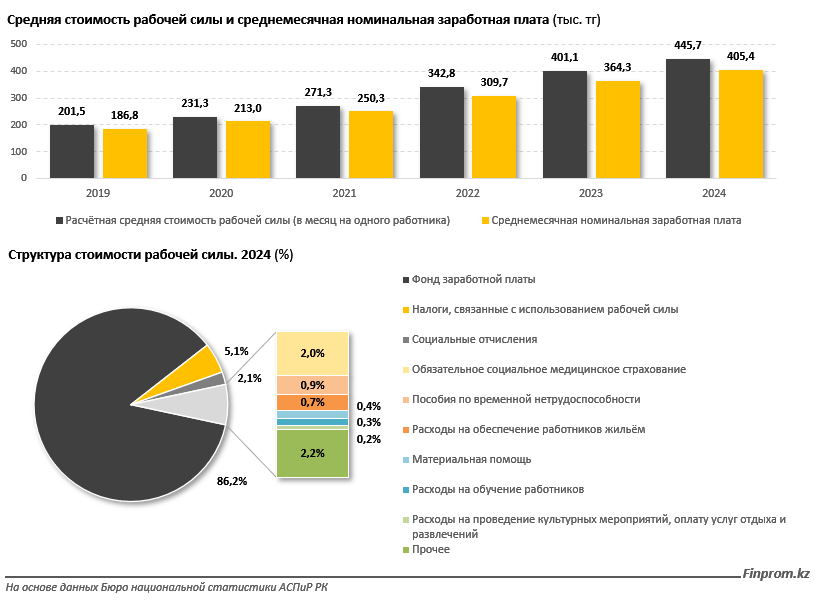 Согласно данным бюро национальной статистики, в 2024 году на фонд оплаты труда пришлось лишь 86,2% всех расходов, связанных с содержанием персонала. Оставшиеся 13,8% составили обязательные платежи и дополнительные статьи затрат, включая налоги, социальные отчисления, пособия, расходы на обучение, предоставление жилья и организацию отдыха работников.