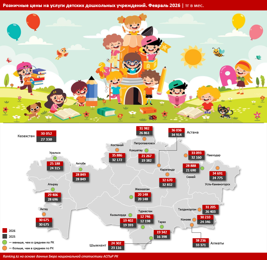 По итогам февраля 2026 года средняя розничная цена на услуги дошкольных учреждений в Казахстане составила 30 тыс. тенге в месяц, передает inbusiness.kz со ссылкой на Ranking.kz.