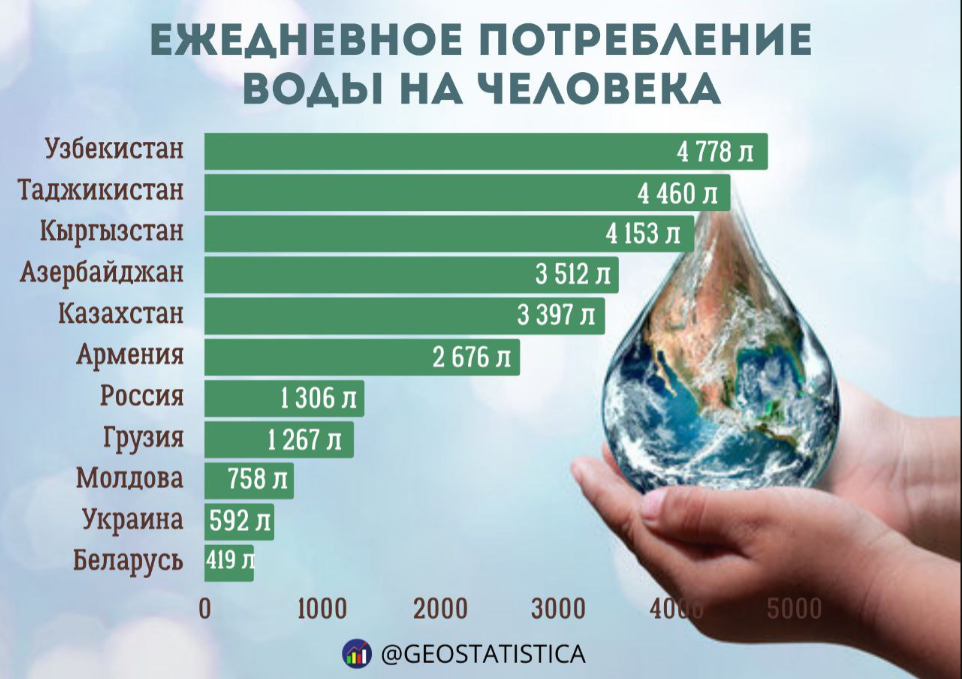 В странах СНГ показатели значительно различаются. Лидерами по суточному потреблению остаются Узбекистан (4778 л), Таджикистан (4460 л) и Кыргызстан (4153 л). Казахстан занимает пятое место с показателем 3397 литров на человека в день, что делает страну одним из наиболее "водоемких" государств региона.