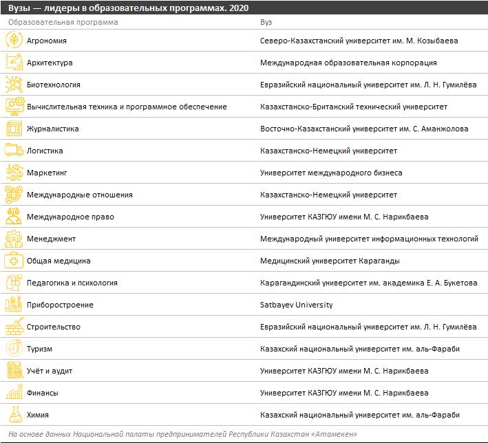 В то же время, по информации Национальной палаты предпринимателей Республики Казахстан "Атамекен", которая учитывает такие параметры, как процент трудоустройства и заработная плата выпускников, большинство университетов, лидирующих по определённым образовательным программам в стране, вовсе не были представлены в мировом рейтинге. Так, по образовательной программе в сфере агрономии лидирует Северо-Казахстанский университет им. М. Козыбаева, в сфере архитектуры — Международная образовательная корпорация, в сфере общей медицины — Медицинский университет Караганды, и т. д.