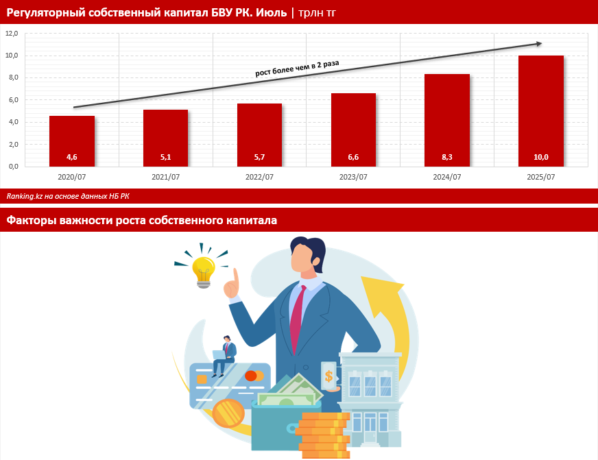 По состоянию на 1 августа 2025 года регуляторный собственный капитал БВУ РК составил 10 трлн тг, увеличившись с начала года на 5,7%, сообщает inbusiness.kz со ссылкой на Ranking.kz.