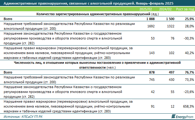 По итогам января–февраля текущего года в Казахстане зарегистрировали 1,9 тыс. административных правонарушений, связанных с алкогольной продукцией — на 25,9% больше, чем за аналогичный период 2024-го, сообщает inbusiness.kz со ссылкой на Еnergyprom.kz.