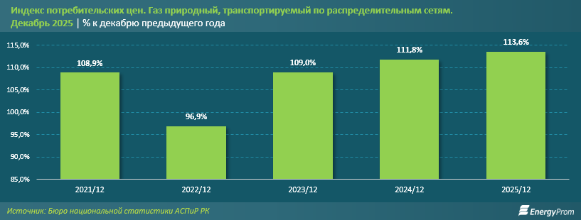 "Для сравнения: в декабре 2024 года цена выросла на 11,8%, в декабре 2023-го — на 9%, а в декабре 2022-го было зафиксировано удешевление на 3,1%. Таким образом, второй год подряд наблюдается ускорение роста тарифов для населения", - пишет Еnergyprom.kz.