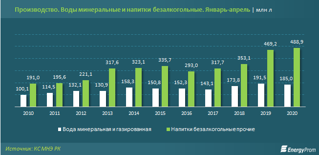 Производство минеральной и газированной воды в период пандемии COVID-19 сократилось: за январь-апрель было выпущено 185 млн литров — минус 3,4% за год. Ранее два года подряд объемы производства в секторе стабильно росли.