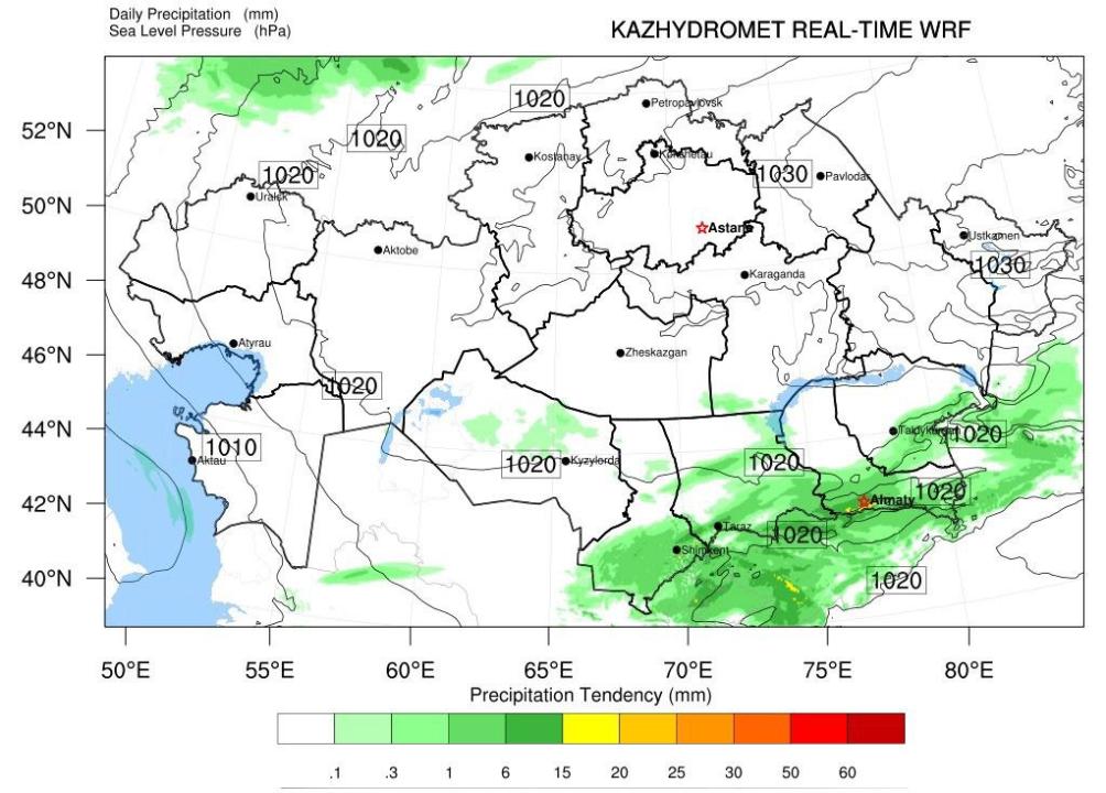 В настоящее время на суперкомпьютере КазНУ имени аль-Фараби осуществляется ежедневный автоматический запуск модели WRF с формированием прогнозов температуры воздуха, атмосферных осадков, параметров ветра и метеограмм по всей территории Казахстана. Расчёты выполняются в автоматическом режиме, параллельно проводится их анализ для дальнейшего повышения качества и точности выходных данных модели.