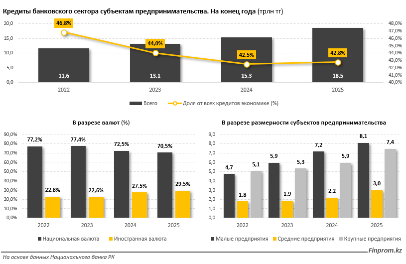 Одновременно усилилась тенденция к увеличению валютных займов. Их доля выросла с 22,8% до 29,5%, а объём в денежном выражении удвоился - с 2,6 трлн до 5,5 трлн тенге. Такая динамика повышает зависимость бизнеса от колебаний обменного курса.