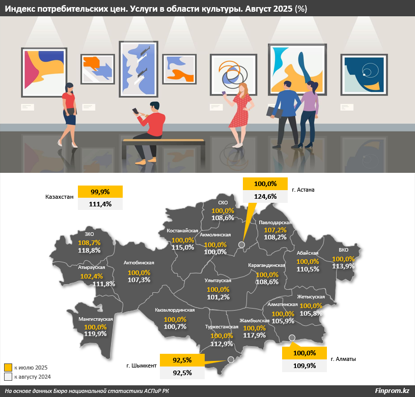 По данным Finprom.kz, в региональном разрезе месячный рост цен в секторе был отмечен только в трёх регионах страны: в Западно-Казахстанской области — на 8,7%, в Павлодарской — на 7,2%, в Атырауской — на 2,4%. Шымкент оказался единственным регионом, где услуги в области культуры подешевели на 7,5%. В остальных регионах цены за месяц не изменились.