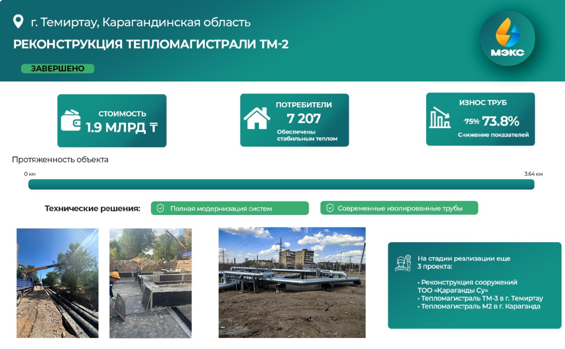 В целом, модернизация позволила снизить износ теплосетей в Темиртау с 75 до 73,8%. Несмотря на кажущуюся незначительность показателя, изменения дают ощутимый результат в плане надёжности, подчеркивают специалисты.