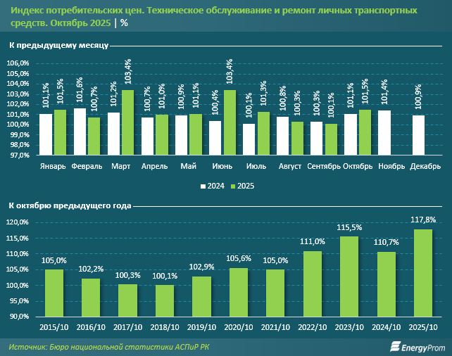Цены на услуги ТО и ремонта личных транспортных средств по итогам октября 2025-го увеличились на 1,5% за месяц, сообщает inbusiness.kz со ссылкой на Еnergyprom.kz.
