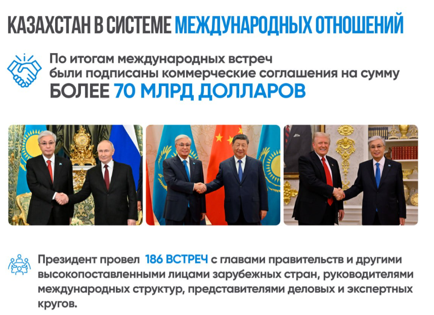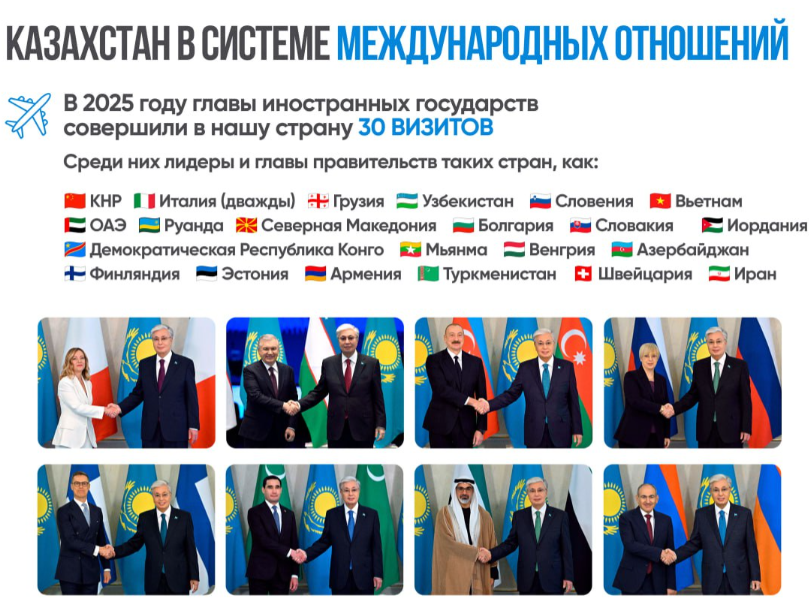 В 2025 году Казахстан укрепил свои позиции в системе международных отношений, активно расширяя сотрудничество с зарубежными партнёрами и создавая платформы для диалога на высшем уровне, inbusiness.kz со ссылкой на помощника-пресс-секретаря президента РК Руслана Желдибая.