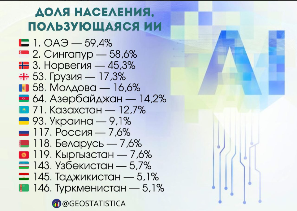 Среди стран СНГ наиболее активной в использовании ИИ оказалась Грузия, занимающая 53 место с показателем 17,3%. Молдова заняла 58 строчку — 16,6%, Азербайджан — 64 место с 14,2%.