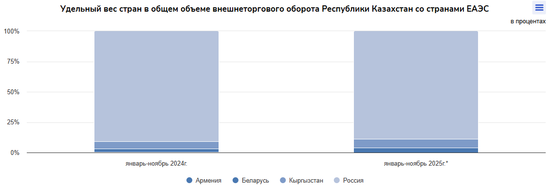 "Отдельного внимания заслуживает динамика взаимной торговли со странами Евразийского экономического союза. В январе–декабре 2025 года товарооборот Республики Казахстан со странами ЕАЭС составил 30893,1 млн долларов, что в номинальном выражении меньше на 0,1%, по сравнению с аналогичным периодом прошлого года", - привели данные в органах госстатистики.