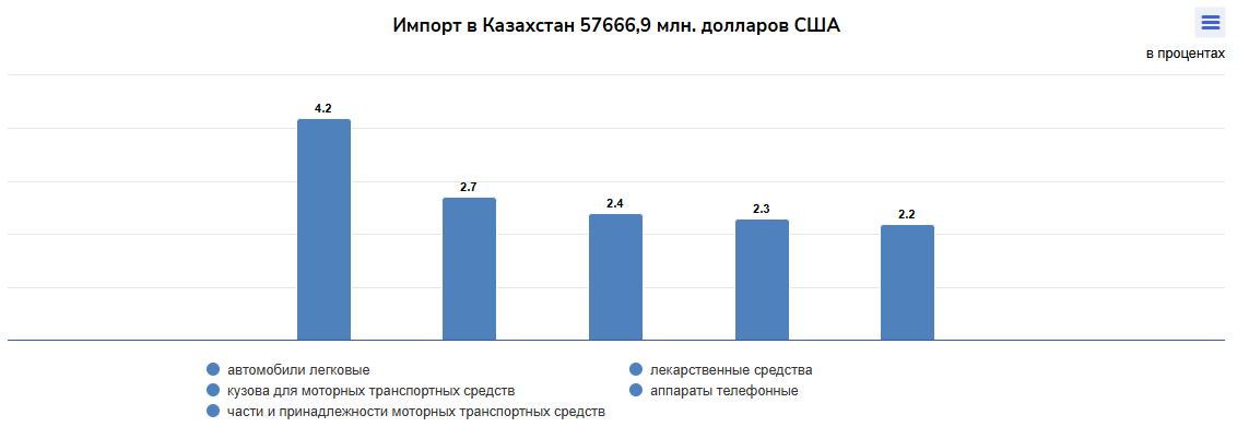 Импортная структура, напротив, отражает высокий спрос на готовую продукцию и товары с высокой добавленной стоимостью. Наибольший удельный вес по импорту приходится на автомобили легковые — 4,4%, лекарственные средства — 2,8%, аппараты телефонные — 2,4%, кузова для моторных транспортных средств — 2,3%, части и принадлежности моторных транспортных средств — 2,2%.