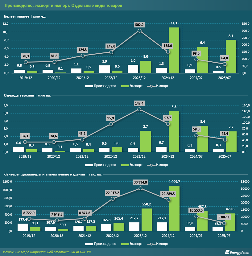 По данным Бюро национальной статистики (БНС) АСПиР РК, объём производства нижнего белья в Казахстане в прошлом году составил 1,3 млн, а экспорт — 11,1 млн изделий. В январе–июле текущего года тенденция продолжилась, экспорт увеличился ещё на 25,9% к аналогичному периоду 2024-го.