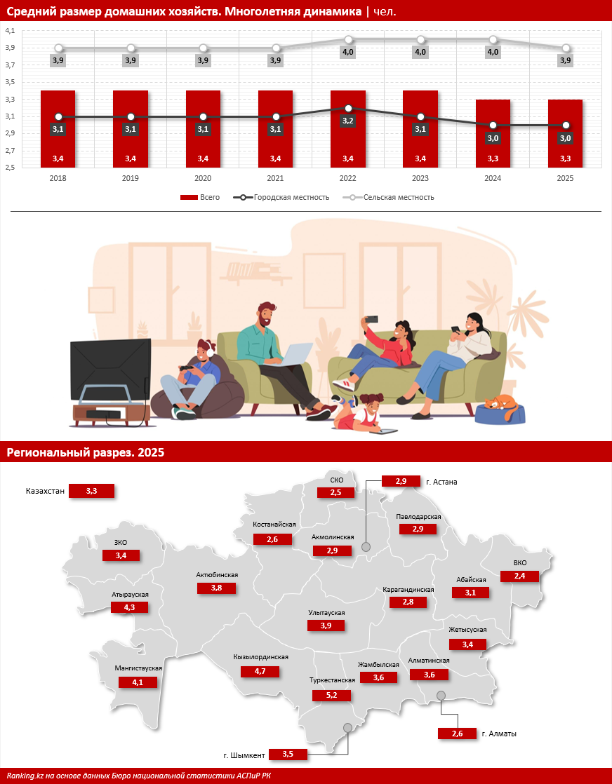 "Средний размер казахстанских домохозяйств значительно различается в зависимости от типа местности. Так, в сёлах одно домохозяйство в 2025 году в среднем состоит из 3,9 человека, а до этого три года подряд средний размер домохозяйств там составлял 4 человека. В городской же местности домохозяйства в среднем состоят из 3 человек, как и годом ранее", - говорится в исследовании.