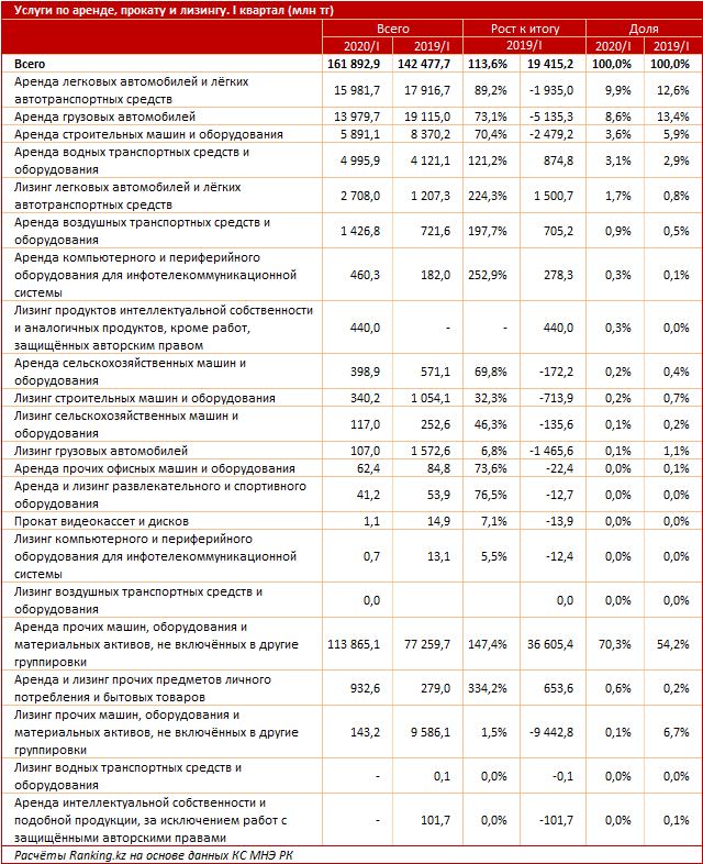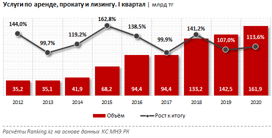 Услуги по аренде, прокату и лизингу за январь-март 2020 года в денежном выражении достигли 161,9 млрд тг — на 13,6% больше, чем за аналогичный период прошлого года. Индекс физического объема к прошлому году составил 110,6%, сообщает ranking.kz.