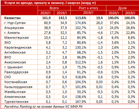 Почти 80% всего объема услуг по аренде, прокату и лизингу приходится лишь на три региона: Нур-Султан (60,9 млрд тг, +74,6%), Атыраускую область (38,9 млрд тг, +2,7%) и Алматы (27,8 млрд тг, −14,3%).