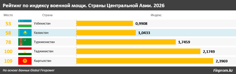 В Центральной Азии формируется чёткая иерархия военной мощи. Согласно рейтингу Global Firepower за 2026 год, лидером региона стал Узбекистан, поднявшийся на 53-е место в мировом списке. Страна демонстрирует стабильный рост военного потенциала на протяжении последних лет, что позволило ей укрепить свои позиции не только в регионе, но и на глобальном уровне.