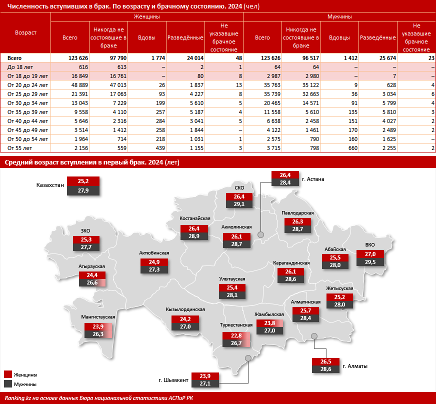 Ну и, наконец, если посмотреть на средний возраст вступления в брак, окажется, что выводы Всемирной организации здравоохранения подтверждаются: высокая рождаемость в раннем возрасте действительно наблюдается в тех же регионах, где для девушек отмечен наименьший средний возраст вступления в первый брак. Это Туркестанская область (22,8 года), Жамбылская область (23,8 года) и Мангистауская область (23,9 года).