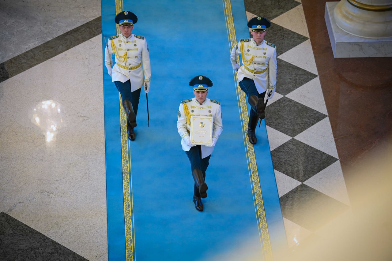 Почетный караул торжественно внес новую Конституцию Республики Казахстан, был исполнен Государственный гимн.