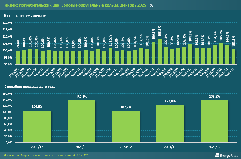 Цены на золотые обручальные кольца в Казахстане растут 17 месяцев подряд, с середины 2024-го, и не снижаются уже более двух лет, передает inbusiness.kz со ссылкой на Еnergyprom.kz.