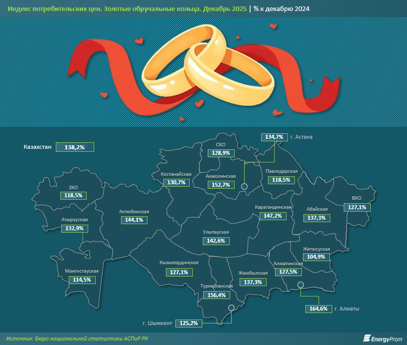 По данным Еnergyprom.kz, в региональном разрезе наибольшее удорожание золотых обручальных колец было отмечено в Алматы: на 64,6%.
