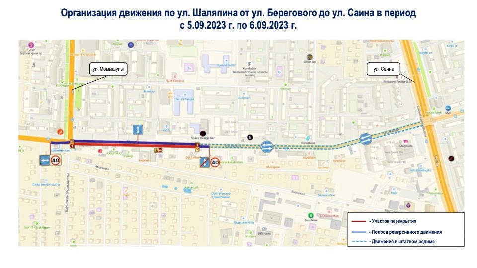 "С 23:00 5 сентября до 06:00 6 сентября в связи с проведением среднего ремонта будет частично перекрыто движение по южной стороне ул. Шаляпина – от ул.Саина до ул.Момышулы.