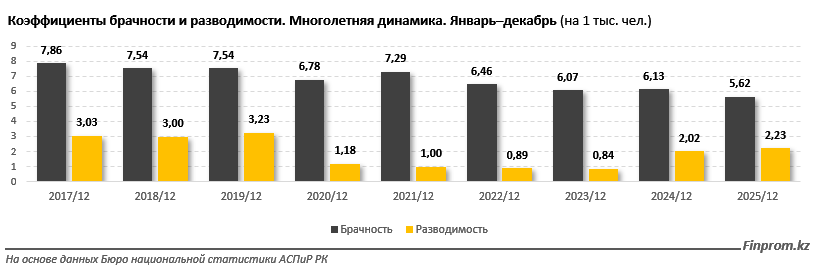 "Долгосрочный тренд на сокращение количества браков сохраняется. Коэффициент брачности в 2025 году опустился до 5,62 на 1 тыс. человек, против 6,13 в 2024-м. Для сравнения: в 2017 году он составлял 7,86. Коэффициент разводимости вырос до 2,23 на 1 тыс. человек, против 2,02 в 2024-м, что постепенно возвращает показатель к уровню до пандемии, хотя пока он всё ещё держится ниже значений 2017–2019 годов (более 3)", - пишет Finprom.kz.