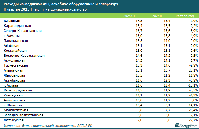 "В региональном разрезе наибольшие расходы на медикаменты, медоборудование и аппараты понесли жители Карагандинской области: 18,4 тыс. тг в среднем на семью — на 0,2% меньше, чем годом ранее. Второе и третье места заняли Северо-Казахстанская область (16,7 тыс. тг) и Алматы (16 тыс. тг). Наименьшие расходы в секторе были зафиксированы в Жетысуской (7 тыс. тг), Западно-Казахстанской (8,6 тыс. тг) и Мангистауской (9,8 тыс. тг) областях", - говорится в исследовании.