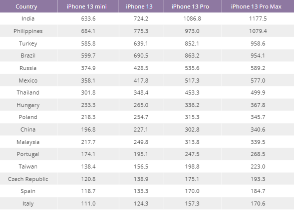 При расчете издание учитывало стоимость iPhone в зависимости от страны и среднюю годовую зарплату ее жителей. Таким образом, было вычислено, сколько часов должны будут работать люди, чтобы получить достаточно денег на покупку iPhone 13.