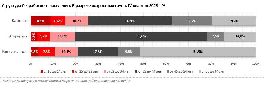 "Сравним структуру безработного населения в регионах с низким и высоким уровнем безработицы. В Атырауской области, где уровень безработицы составляет 4,9%, доминирует возрастная группа от 35 до 44 лет (58,6%), а доля молодёжи от 16 до 24 лет минимальна (всего 2,8%). Безработица в Карагандинской области выглядит иначе. Напомним: в этом центральном регионе уровень безработицы составляет всего 4%. При этом больше половины (51,5%) незанятых составляют граждане предпенсионного возраста. Доля молодых безработных там намного меньше", - говорится в сообщении.