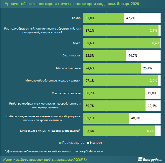 В то же время лишь немногим более половины спроса казахстанские производители смогли перекрыть в сегменте колбас (59,1%), сыра и творога (55,3%) и сахара (52,8%)