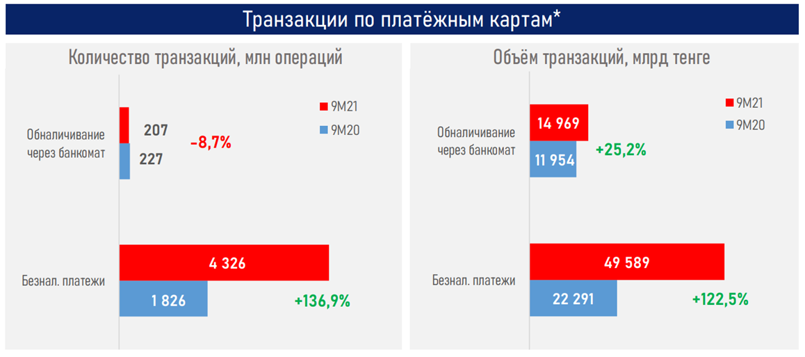 Объём безналичных карточных транзакций за январь–сентябрь вырос в 2,2 раза, до 49,6 трлн тенге (за 9М20 - 22,3 трлн тенге). На этом фоне доля безналичных операций увеличилась с 65,1% до 76,8% (г/г).