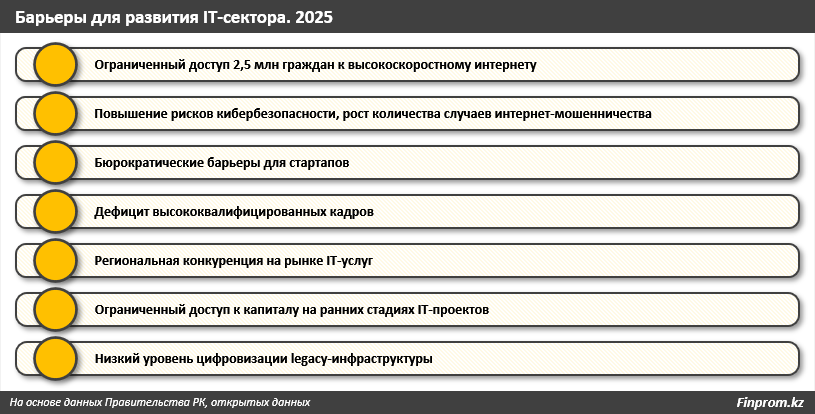 Кроме того, Казахстан сталкивается с более масштабными вызовами, среди которых — проблемы с финансированием IT-стартапов на ранних стадиях их развития, бюрократические трудности при регистрации и оформлении документов для компаний, а также низкий уровень цифровизации устаревших инфраструктур. Во многих отраслях продолжают использоваться старое оборудование и программы, что затрудняет внедрение новых технологий. Все эти факторы замедляют темпы технологических изменений и требуют комплексного подхода для устранения барьеров.