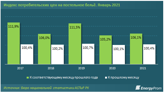 Стоимость комплекта постельного белья в январе 2021 года выросла к соответствующему месяцу прошлого года на 6,1%. Для справки: годом ранее был отмечен рост на 5,2%.