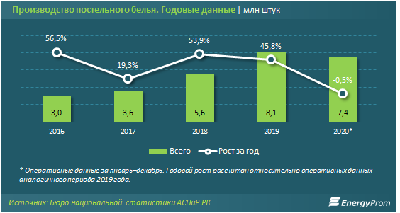 Производство постельного белья в 2020 году превысило 7,4 млн штук, что, впрочем, на 0,5% меньше по сравнению с аналогичным периодом 2019 года*.