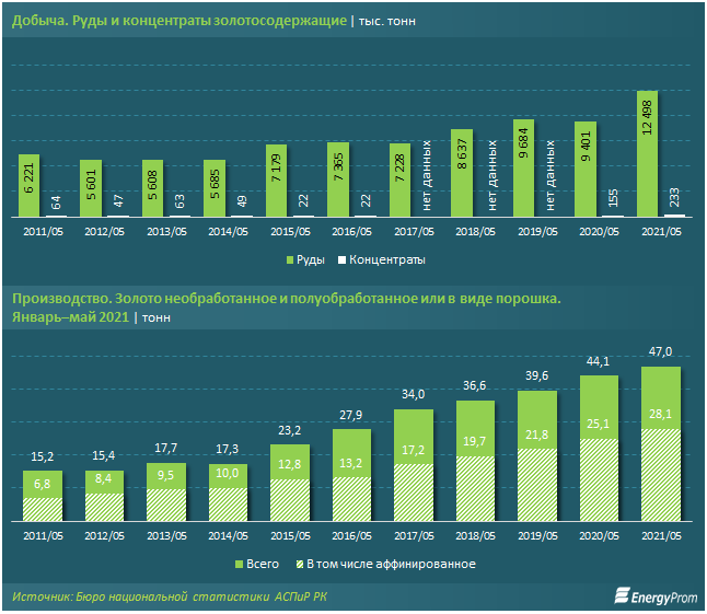 Что касается непосредственно наличия сырья в РК — и добыча, и производство золота в стране растут. Так, за 5 месяцев в РК добыли 12,5 млн тонн золотосодержащих руд — на треть больше, чем годом ранее, — и 233 тыс. тонн концентратов — сразу в полтора раза больше, чем год назад.