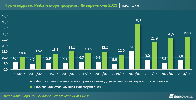 Так, выпуск свежей, охлаждённой или мороженой рыбы за январь–июль 2023-го составил 27,3 тыс. тонн — на 3,1% больше по сравнению с аналогичным периодом прошлого года.