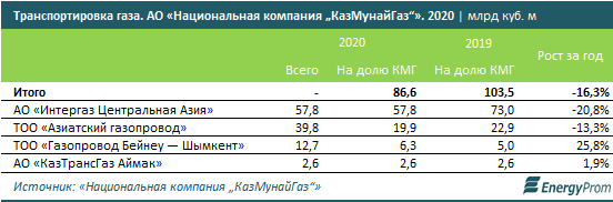 НК "КазМунайГаз" огласила производственные результаты за 2020 год. Объем транспортировки газа по магистральным газопроводам компании за 2020 год уменьшился на 16,3%, до 86,6 млрд куб. м. В основном это связано с уменьшением объемов транзита среднеазиатского газа в Китай, транзитных потоков российского газа ПАО "Газпром" через территорию РК, экспортных поставок Карачаганакского газа в Россию и объема экспорта газа с Тенгиза по причине сокращения его добычи.