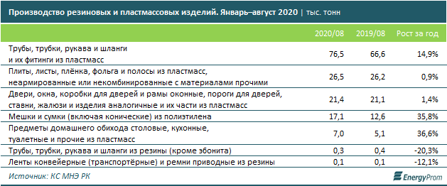 В натуральном выражении по сравнению с январем-августом прошлого года рост показали только продукты из пластмассы: так, производство пластмассовых предметов домашнего обихода выросло на 36,6%, до 7 тыс. тонн; мешков и сумок — на 35,8%, до 17,1 тыс. тонн; вырос также выпуск труб и шлангов и их фитингов из пластмассы — на 14,9%, до 76,5 тыс. тонн.