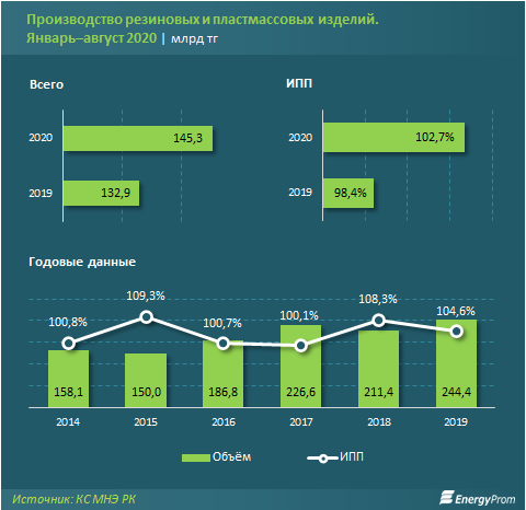 Объем производства резиновых и пластмассовых изделий в РК за январь-август 2020 года составил 145,3 млрд тг, что в денежном выражении на 9,3% больше по сравнению с прошлым годом (при этом ИПП — всего 102,7%), сообщает energyprom.kz.