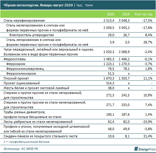 Производство в сфере черной металлургии за январь-август 2020 года в денежном выражении составило 1,1 трлн тг — на 6,2% меньше, чем за январь-август 2019-го (ИПП — 97,8%), сообщает energyprom.kz.