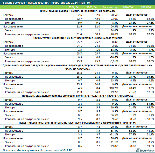В натуральном выражении в сегменте пластмассовой продукции выросло производство труб, рукавов и шлангов (на 21,4%, до 67,8 тыс. тонн), а также дверей, окон и их частей из пластмасс (на 7%, до 18,8 тыс. тонн).