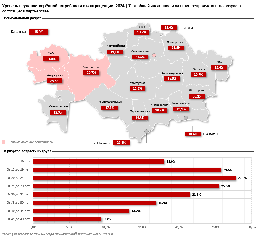 В разрезе возрастных групп наиболее высокий уровень неудовлетворённой потребности в контрацепции в 2024 году наблюдался среди женщин в возрасте от 20 до 24 лет: 27,8%. Тревожный показатель также был зафиксирован в самой юной категории — среди подростков от 15 до 19 лет: 25,8%. Ранее мы писали о том, почему казахстанская молодёжь, имеющая опыт сексуальных отношений, нередко не пользуется противозачаточными средствами.