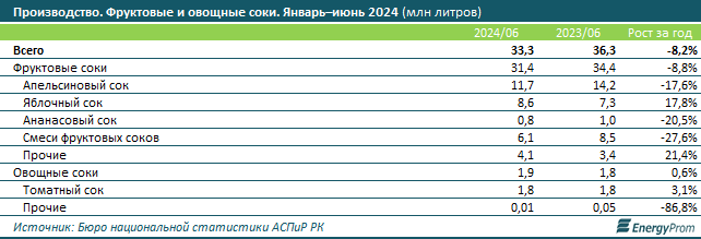 Как пишет Еnergyprom.kz, объём производства фруктовых и овощных соков в Казахстане за январь–июнь текущего года составил 33,3 млн литров — на 8,2% меньше, чем за аналогичный период 2023-го.