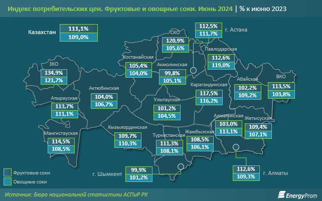 Для сравнения: в мае цены на соки выросли на 1,2%, а в июне 2023 года — на 1,8%, сообщает inbusiness.kz со ссылкой на Еnergyprom.kz.