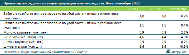 К 1 декабря 2022 года поголовье основных видов сельскохозяйственных животных в Казахстане выросло, за исключением коз (минус 0,9% за год, до 2,3 млн голов) и свиней (минус 10% за год, до 812,5 тыс. голов).
