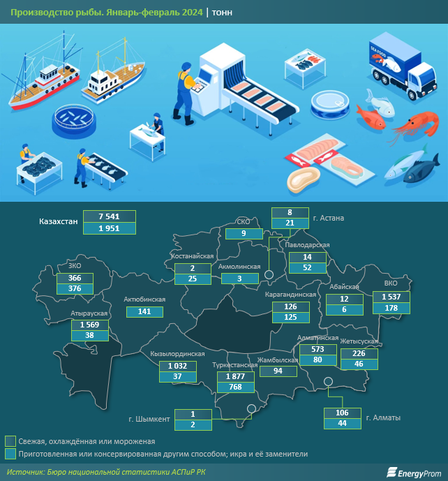 "В региональном разрезе лидером по производству свежей, охлаждённой или мороженой рыбы стала Туркестанская область: 1,9 тыс. тонн, годовой рост — на 18,1%. На второй и третьей строчке расположились Атырауская (1,6 тыс. тонн) и Восточно-Казахстанская (1,5 тыс. тонн) области", - говорится в исследовании.