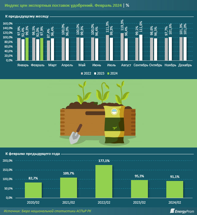 Цены экспортных поставок удобрений снижались два месяца подряд и по итогам февраля 2024 года опустились на 2,1% за месяц. В январе цены показывали спад на 0,7%, а в феврале прошлого года — сразу на 8%.