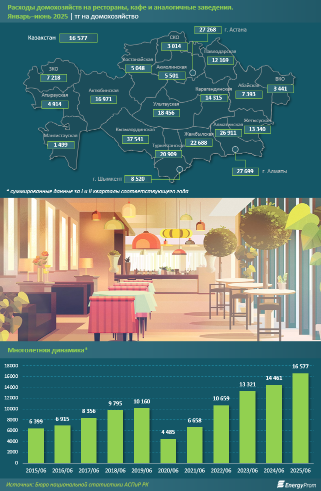 "В среднем по Казахстану расходы домохозяйств на рестораны и кафе за январь–июнь 2025 года составили 16,6 тыс. тг. Для сравнения: в первом полугодии 2024-го расходы домохозяйства показатель составлял 14,5 тыс. тг, а в аналогичном периоде 2023 года — 13,3 тыс. тг.", - говорится в исследовании.